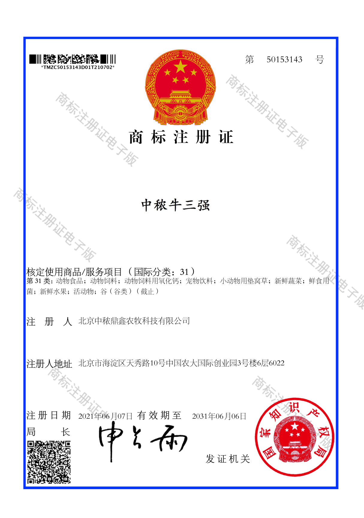 中秾牛七優商標注冊證書
