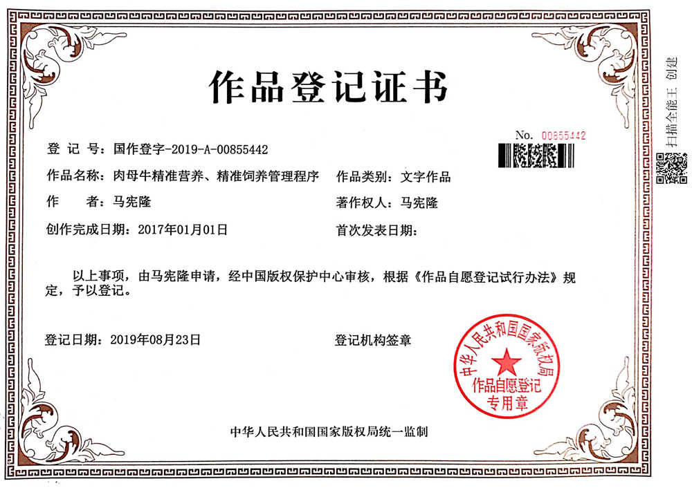 肉牛精準營養版權登記證書